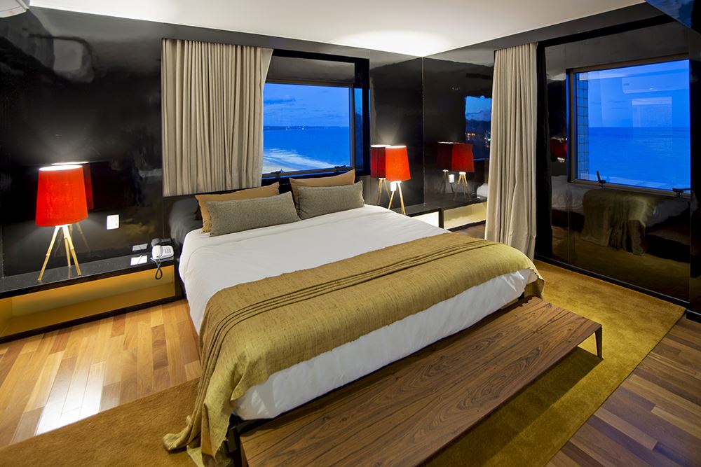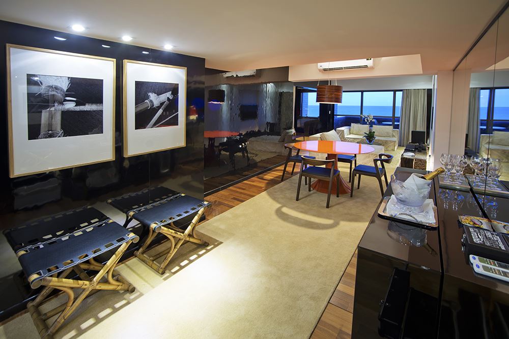 Visando oferecer para o mercado corporativo uma opção de alto padrão e luxo, a suíte possui 120m², duas portas de entrada com hall, sala com dois sofás, uma sala de reunião para até 12 pessoas, closet, banheiro com ofurô japonês de madeira e dois chuveiros, cama king size, adega de vinhos climatizada e uma varanda com uma bela vista para o mar.